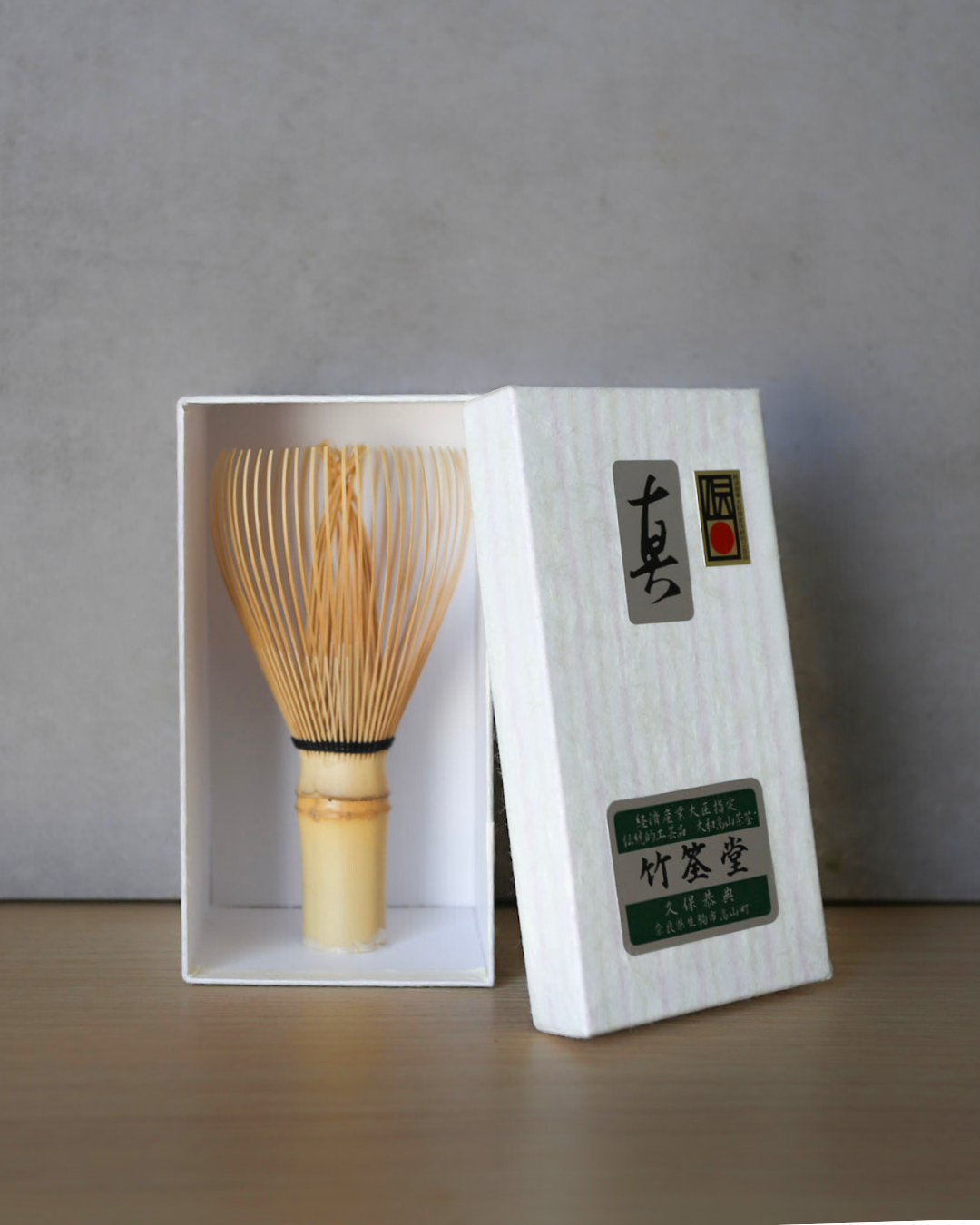 Este chasen es una pieza única, tallada a mano a partir de bambú maduro de crecimiento antiguo en la ciudad de Nara, Japón, por el maestro artesano Kubo Kyosuke.